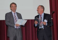 Prof. Bretthauer, editor-in-chief of the journal "at-Automatisierungstechnik", hands out the certificate to Prof. Leonhardt representing the iSHUNT team in Boppard.