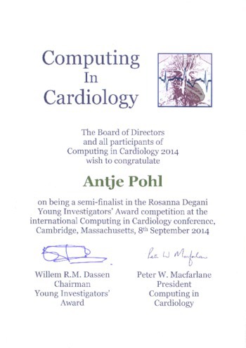 The paper "High Specificity IEGM Beat Detection by Combining Morphological and Temporal Classification for a Cardiac Neuromodulation system" by Antje Pohl et al., was awarded with the Honorable Mention Award as being semi-finalist in the Rosanna Degani Young Investigator Award at the conference Computing in Cardiology 2014 (CinC), September 7th - 10th, Cambridge, MA, USA.