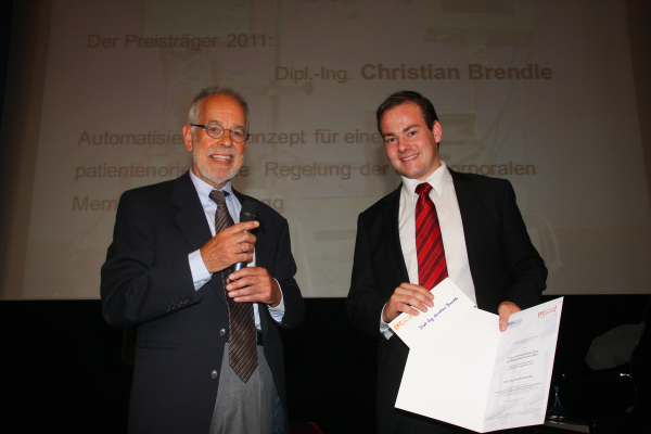 30th Sept. 2011: Dipl.-Ing. Christian Brendle receives the Viktor und Mirka Pollak-Prize on Medical Engineering 2011 for his excellent diploma thesis “Patient orientated automation of the therapy with the Extracorporeal Membrane Oxygenation". Prof. Meyer-Ebrecht awarded the prize on the occasion of the official ceremonial act on the 50-years existence of the Faculty of Electrical Engineering and Information Technology at the RWTH Aachen.