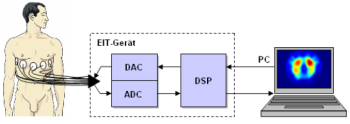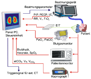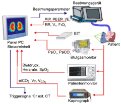 - Physikalische und methodische Integration der elektrischen-Impedanz-Tomographie (EIT), einem Verfahren zur Darstellung der räumlichen Impedanzverteilung in einem von einer Elektrodenebene aufgespannten Körperquerschnitt (Bild 3), mit dem Informationen über die regionale Verteilung von Ventilation gewonnen werden kann