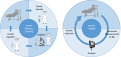 Zur Kontrolle der Blutwerte, sowie des Blutzuckerspiegels wird bei den Patienten alle 4-8h eine Blutgasanalyse genommen. Bei hohen Blutzuckerwerten kann eine Therapie durch externe Injektion von Insulin erfolgen (siehe Fig. 1). Die gängige konventionelle Therapie sieht dabei einen Eingriff erst bei stark erhöhtem Blutzuckerspiegel (>180 mg/dL) vor.