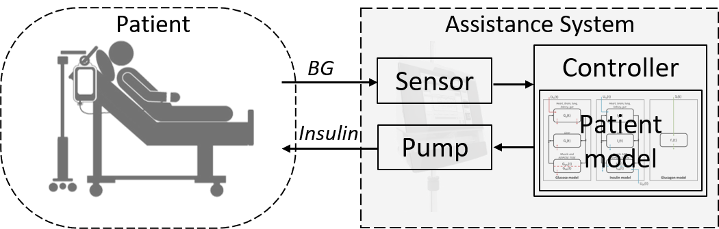 Ein Assistenzsystem basierend auf einem Glucosesensor, einem Insulinperfusor, sowie dem Steuergerät ermöglicht eine sichere intensive Insulintherapie bei reduziertem Aufwand für das Pflegepersonal (siehe Fig. 2). Dabei kontrolliert der Sensor in regelmäßigen Abstand den Blutzuckerspiegel des Patienten, die Daten werden an ein Steuergerät übermittelt. Ein Regelalgorithmus kann dann aus dem gemessenen Verlauf des Blutzuckerspiegels die optimale Insulinmenge berechnen und dem Patienten mittels Perfusor zuführen. Robuste Regelalgorithmen bieten dabei ein hohes Maß an Stabilität und Sicherheit des Reglers.
