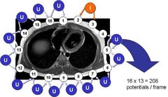 In Abb. 2 ist das EIT-Messprinzip dargestellt. Es wird eine sogenannte "adjazente Elektrodenkonfiguration" verwendet. An zwei benachbarten ("adjazenten") Elektroden (hier 2 und 3) wird ein kleiner Wechselstrom (I) eingespeist und an allen verbleibenden 13 Elektrodenpaaren werden Differenzspannungen (U) gemessen. Nachdem alle 13 Spannungen gemessen wurden, wird die Stromeinspeisung auf das nächste Elektrodenpaar (hier 3 und 4) verschoben und die Spannungsmessungen an den übrigen Elektroden werden wiederholt. Die Stromeinspeisung wird zirkular verschoben, bis alle 16 Elektrodenpaare für die Stromeinspeisung einmal verwendet wurden. Für jede Stromeinspeisung werden Spannungsmessungen an den verbleibenden 13 Elektrodenpaaren durchgeführt. Dies führt zu einem Satz von 16 × 13 = 208 Spannungsmessungen, der als „Frame“ bezeichnet wird.