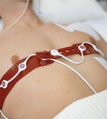 Wie in Abb. 1 dargestellt, ist der Gürtel gewöhnlich auf der Ebene des 4. bis 6. Interkostalraumes ("anatomischer Raum zwischen zwei Rippen") angeordnet und umspannt daher große Bereiche der Lunge sowie das Herz in der abgebildeten Region. Eine weitere Referenzelektrode befindet sich in größerem Abstand zum Riemen und stellt sicher, dass alle Spannungsmessungen in Bezug auf das gleiche Massepotential durchgeführt werden. Kontakt Gel kann verwendet werden, um die elektrische Verbindung zwischen Elektrodenoberfläche und der Haut des Patienten zu verbessern.