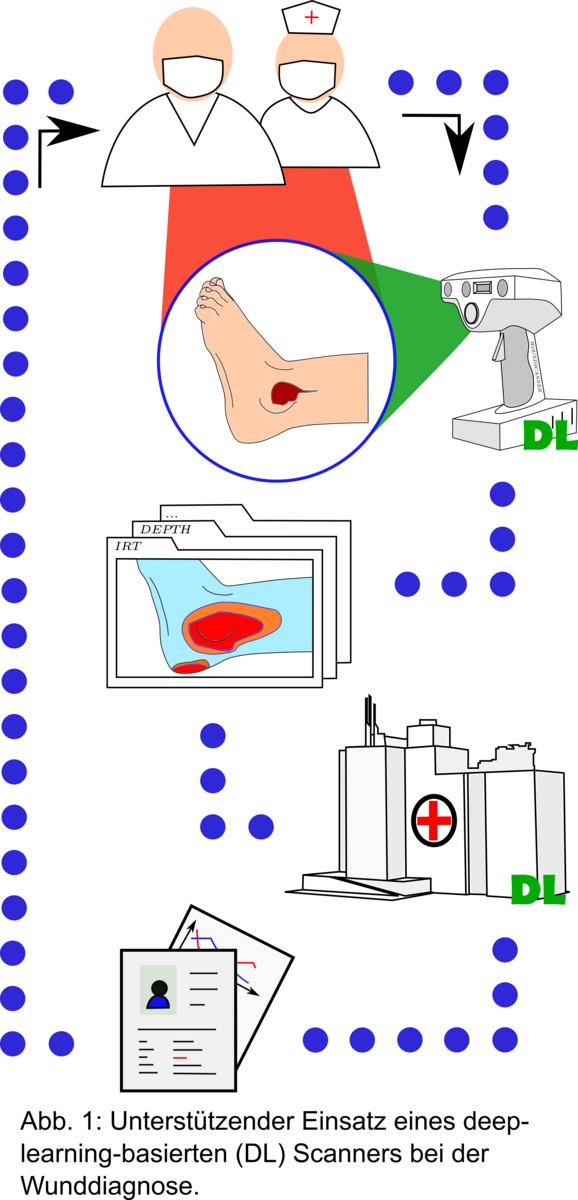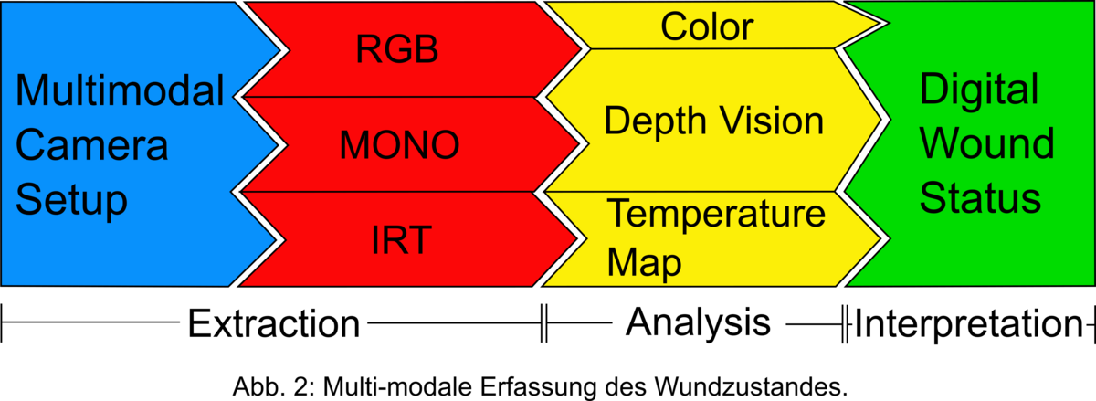 Durch die Kombination der Messung der Temperaturverteilung der Haut mit klassischen, visuellen Features, wird in diesem Projekt ein kleiner, mobiler, multi-modaler „Wundscanner“ entwickelt, welcher neben einer Infrarot Thermographie (IRT) Kamera auch RGB und/oder Monochrome Kameras für Farbauswertung und Tiefeninformation enthalten soll. Die diagnostische Aufgabe des Scanners werden das Aufnehmen der Bilder, die Ableitung von Wundparametern, sowie die deep learning(DL)-basierte Augenblicksanalyse sein. Danach sollen die akquirierten Informationen sicher und nahtlos auf typische Krankenhaus-Server übertragbar und in eine digitale Patientenakte überführbar sein. Aufgrund der so kontinuierlich über den Behandlungszeitraum gesammelten Daten kann dann eine weitere KI-gestützte Langzeitanalyse durchgeführt werden.