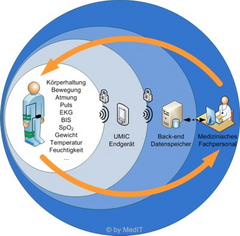 Der Schwerpunkt des UMIC Exzellenzcluster ist die Entwicklung von mobilen Informations- und Kommunikationssystemen der nächsten Generation. Als Teil dieses Clusters werden ebenfalls innovative Applikationen erforscht und entwickelt. Dabei sind medizinische Anwendungen ein zentrales Szenario. Die sogenannte HealthNet Vision vereint multi-disziplinäre Institute aus dem Bereich der Medizintechnik, Textiltechnik und Informationstechnik. Die HealthNet Vision beschreibt ein Patienten-orientiertes Netzwerk, welches Patienten und Mediziner, unabhängig vom Ort, miteinander verbinden soll (siehe Abbildung 1). Diese Art der häuslichen Gesundheitsversorgung ist Vorraussetzung, um die steigenden Kosten im Gesundheitswesen im bezahlbaren Rahmen zu halten. Schlüsseltechnologie sind drahtlose Sensoren, die die Vitalparameter des Patienten, wie z.B. EKG und Atemfrequenz, messen und über ein energie-effizientes, ereignisgesteuertes Netzwerk zum Arzt übertragen. Zusätzlich sollen Peer-to-Peer Technologien genutzt werden um die Daten zeitnah autorisierten Medizinern zur Verfügung zu stellen.