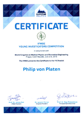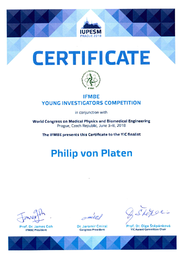Mit seinem Beitrag "Assistance Ratio: an approach to quantify the hydraulic load distribution in LVAD therapy" hat Philip von Platen auf dem World Congress on Medical Physics and Biomedical Engineering (IUPESM), 3. - 8. Juni 2018, Prague, Czech Republic den zweiten Platz in der Young Investigators Competition belegt.