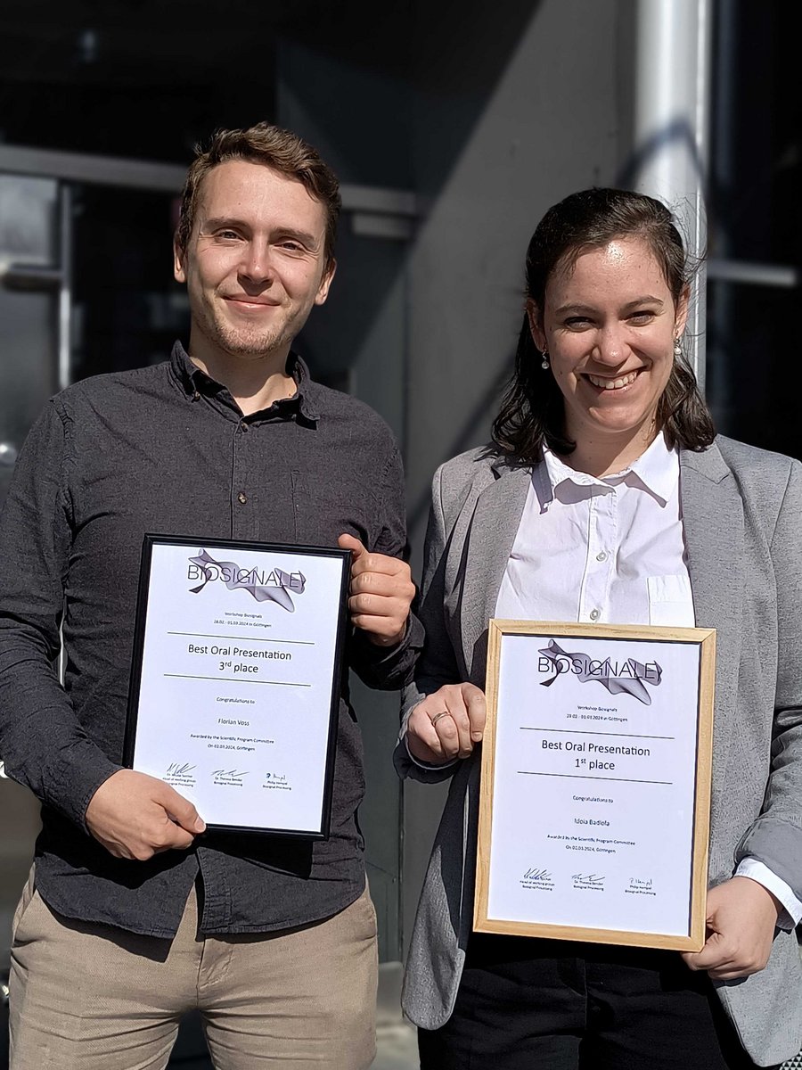 Wir gratulieren unserer Kollegin Idoia Badiola und unserem Kollegen Florian Voss zu ihren herausragenden Leistungen beim Workshop Biosignale, der vom 28.02. – 01.03.2024 in Göttingen stattfand.