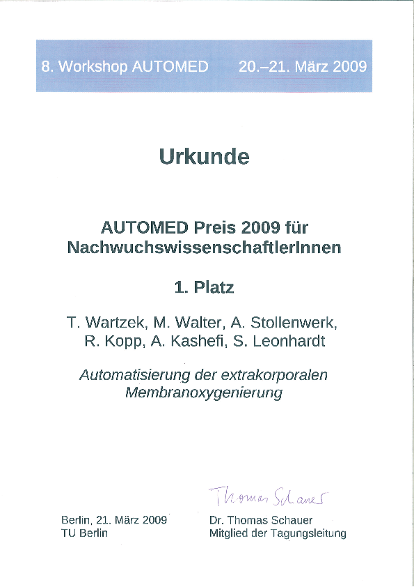 Herr Dipl.-Ing. Tobias Wartzek belegte mit seinem Beitrag "Automatisierung der extrakorporalen Membranoxygenierung" auf der AUTOMED 2009 Konferenz den 1. Platz im Wettbewerb für NachwuchswissenschaftlerInnen.