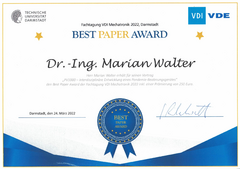 An der Fachtagung VDI Mechtronik 2022 in Darmstadt wurde Herr Dr. Walter für seinen Vortrag "PV1000 - Interdiszplinäre Entwicklung eines Pandemie-Beatmungsgeräts" mit dem Best Paper Award ausgezeichnet.