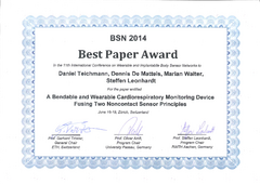 Dipl.-Ing. Daniel Teichmann gewinnt zusammen mit seinen Mitautoren Dennis De Matteis, Dr. Walter und Prof. Leonhardt den Best Paper Award der "International Conference on Wearable and Implantable Body Sensor Networks" (BSN 2014) in Zürich.
