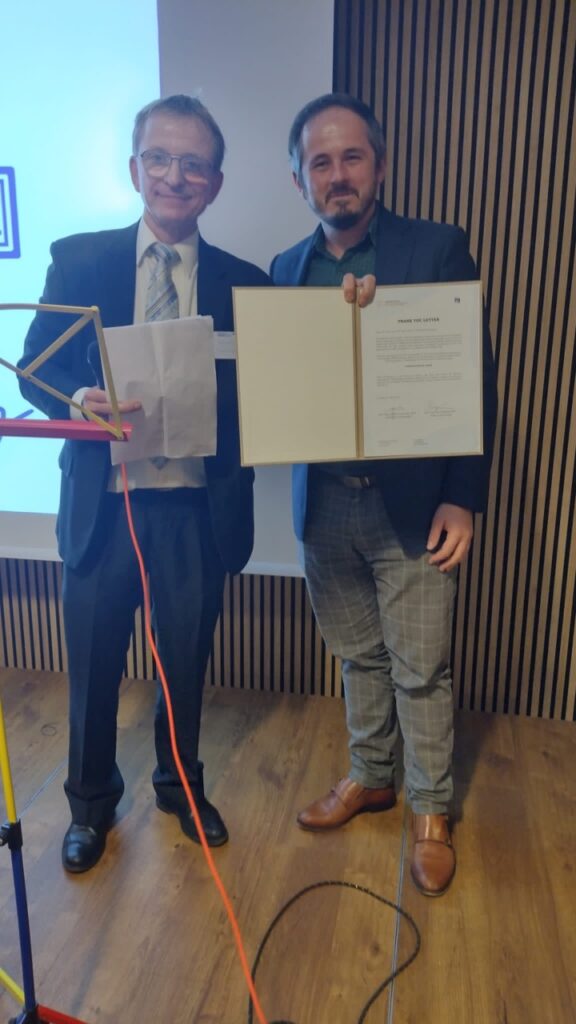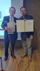 Im Rahmen unserer Feier zum 20-jährigen Bestehen des Lehrstuhls wurde von Prof. Dr. Ing. Štefan Borik im Namen des Dekans der FEIT-Fakultät, Prof. Ing. Pavla Špánik und der Leiter der Abteilung KTEBI Prof. Ing. Ladislav Janoušek eine Erinnerungsmedaille und ein Dankesschreiben übergeben, das von Prof. Steffen Leonhardt im Namen des Instituts entgegengenommen wurde.