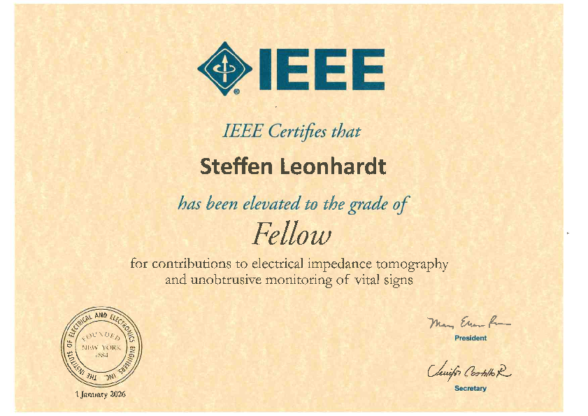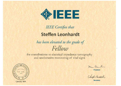Herr Prof. Leonhardt freut sich, dass er für seine Beiträge auf dem Gebiet der elektrischen Impedanztomographie und des kontaktlosen Monitorings von Vitalparametern zum IEEE-Fellow ernannt wurde.