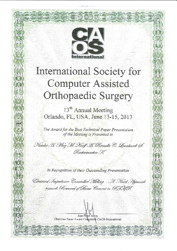 Im Rahmen des gemeinsamen BMBF-Forschungsvorhabens ICOS gewinnen die beiden Lehrstühle MediTEC und MedIT den "Best Technical Paper Presentation Award" auf der CAOS 2013 in Orlando, FL, USA. Das Paper von A. Niesche et al. betrachtet eine Simulation der Fräswegstrategie und -generierung unter Annahme einer Durchbruchsdetektion.