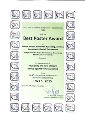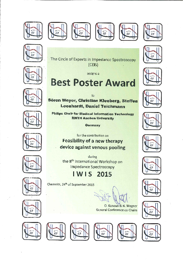 Mit einem Beitrag zu ihrem Projekt RheoStim haben Herr Dipl.-Ing. Sören Weyer, Herr Dr. Dipl.-Phys. Christian Kleeberg, Herr Prof. Dr.-Ing. Dr. med Steffen Leonhardt und Herr Dr.-Ing. Daniel Teichmann den Best Poster Award beim „International Workshop on Impedance Spectroscopy“ erhalten.