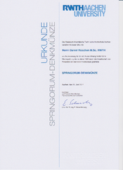 Im Rahmen der Festveranstaltung der RWTH und ihrer Freundesgesellschaft proRWTH wurden herausragende Absolventinnen und Absolventen mit der Springorum-Denkmünze geehrt. Diese wird als Dank an den Mitbegründer und langjährigen Vorsitzenden von proRWTH, Dr.-Ing. E.h. Friedrich Springorum, von der Freundesgesellschaft verliehen.
