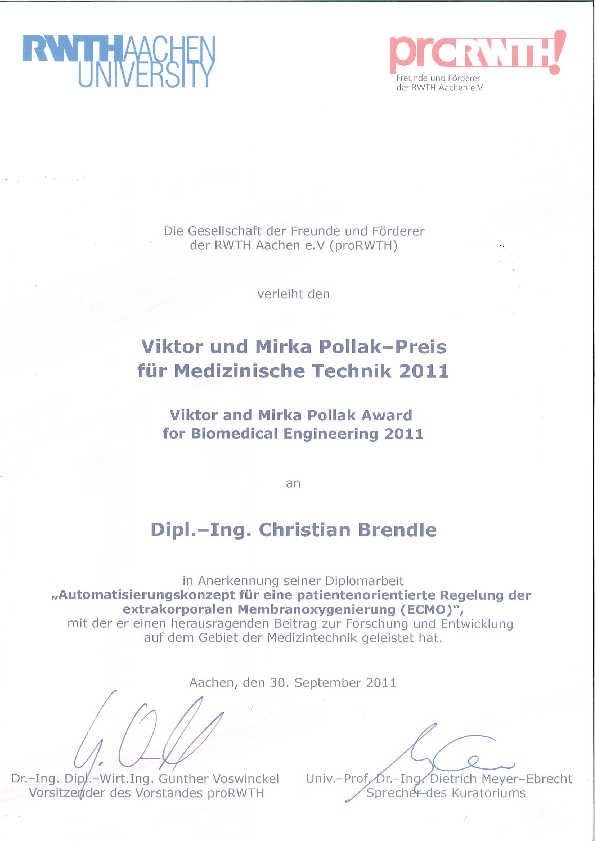 30. Sept. 2011: Dipl.-Ing. Christian Brendle erhält den Viktor und Mirka Pollak-Preis für Medizinische Technik 2011 für seine herausragende Diplomarbeit über ein "Automatisierungskonzept für die patientenorientierte Regelung der extrakorporalen Membranoxygenierung". Der Preis wurde auf dem offiziellen Festakt anlässlich des 50-jährigen Bestehens der Fakultät für Elektrotechnik und Informationstechnik der RWTH Aachen von Herrn Prof. Meyer-Ebrecht überreicht.