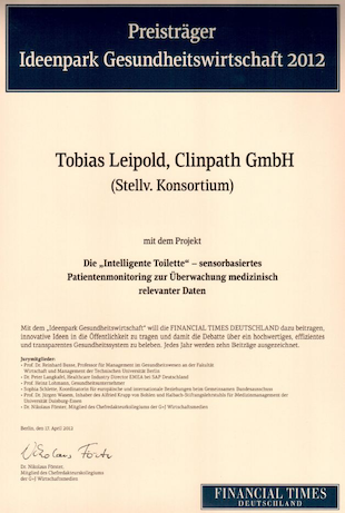 Im Rahmen des Wettbewerbs "Ideenpark Gesundheitswirtschaft", den die 'Financial Times Deutschland' bereits zum siebten Mal veranstaltet, konnte das Konsortium mit dem Projekt der "Intelligenten Toilette" – sensorbasiertes Patientenmonitoring zur Überwachung medizinisch relevanter Daten die Jury überzeugen. Hier das Urteil der hochkarätig besetzten Jury: "Es ist faszinierend, wie auf diese Weise die Erhebung wichtiger Vitaldaten vereinfacht werden kann. Der Patient, aber auch der Arzt müssen sich selbst nicht mit komplizierter Technik beschäftigen. Darüber hinaus überzeugt der Ansatz, weil die intelligente Toilette ohne großen Aufwand nicht nur in Pflegeheimen und Kliniken, sondern auch in privaten Wohnungen installiert werden kann."