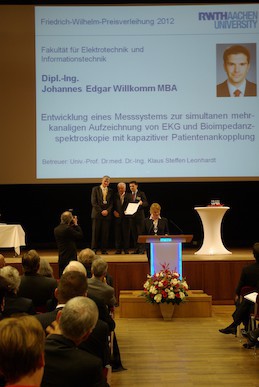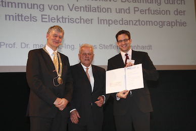 Im Rahmen einer abendlichen Festveranstaltung wurde von unserem Rektor Prof. Schmachtenberg die am MedIT angefertigte Diplomarbeit "Entwicklung eines Messsystems zur simultanen mehrkanaligen Aufzeichnung von EKG und Bioimpedanzspektroskopie mit kapazitiver Patientenankopplung" von Herrn Dipl.-Ing. Johannes Wilkomm sowie die Dissertation "Automatisierte protektive Beatmung durch Bestimmung von Ventilation und Perfusion der Lunge mittels Elektrischer Impedanztomographie" von Herrn Dr.-Ing. Henning Lüpschen mit dem Friedrich-Wilhelm-Preis ausgezeichnet.